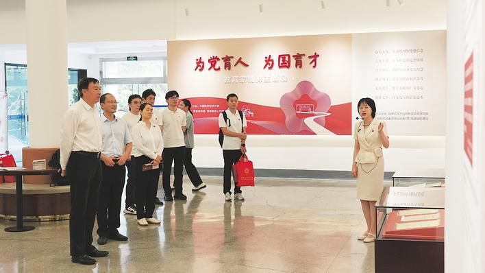“为党育人 为国育才——教育家精神主题展”悄然开展,展柜摆放着泛黄的讲义、手写的教材和墨迹可见的旧信封。一位老师在展板前站了许久,轻声念着严济慈的语句:“要教好书,除要有真学问外,一要大胆,二要少而精,三要善于启发学生,识别人才。”