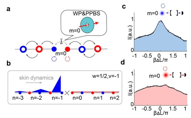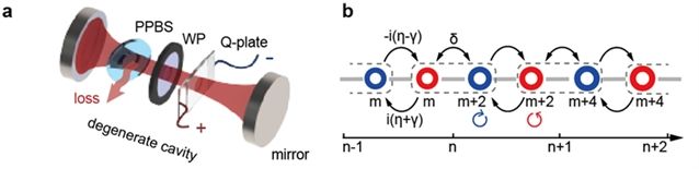 研究团队构建了一个支持多轨道角动量模式的驻波谐振腔(图1a)。通过在腔内引入Q片和波片,分别实现了轨道角动量与自旋角动量(偏振)的耦合,使不同模式间产生耦合。进一步在系统中引入偏振相关的损耗,模拟出具有非厄米特性的合成轨道角动量晶格(图1b),从而诱导出非厄米趋肤效应。